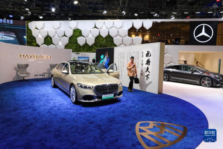 11月5日,参观者经过第六届进博会汽车展区梅赛德斯-迈巴赫S 580e车型。 当日,第六届中国国际进口博览会在国家会展中心(上海)开幕,众多首发首展的新科技、新成果、新展品亮相本届进博会。 新华社记者 辛梦晨 摄