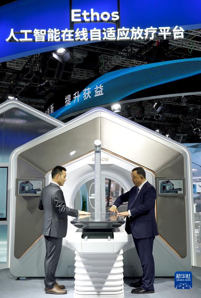 11月5日,在第六届进博会医疗器械及医药保健展区,瓦里安展台展出全球同步首发的第二代Ethos人工智能在线自适应放疗平台。 当日,第六届中国国际进口博览会在国家会展中心(上海)开幕,众多首发首展的新科技、新成果、新展品亮相本届进博会。 新华社记者 刘颖 摄