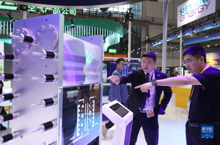 11月5日,工作人员(左)介绍第六届进博会西门子公司展出的电解水制氢装置模型。 当日,第六届中国国际进口博览会在国家会展中心(上海)开幕,众多首发首展的新科技、新成果、新展品亮相本届进博会。 新华社记者 方喆 摄