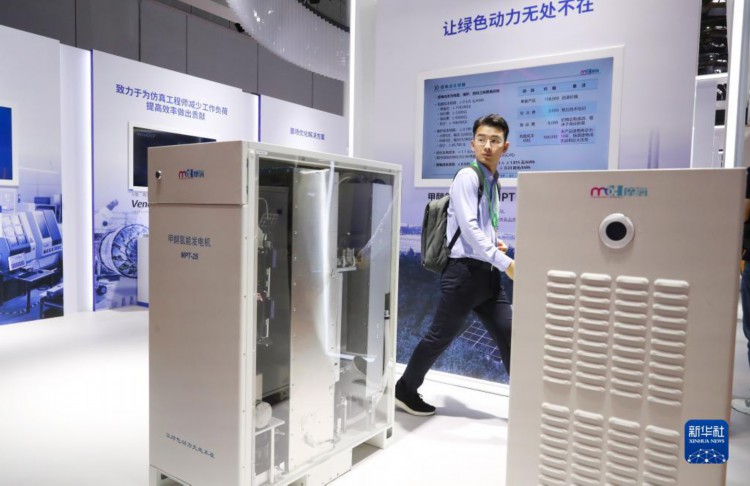11月5日,参观者从第六届进博会东芝公司展出的甲醇氢能发电机展品旁走过。 当日,第六届中国国际进口博览会在国家会展中心(上海)开幕,众多首发首展的新科技、新成果、新展品亮相本届进博会。 新华社记者 方喆 摄