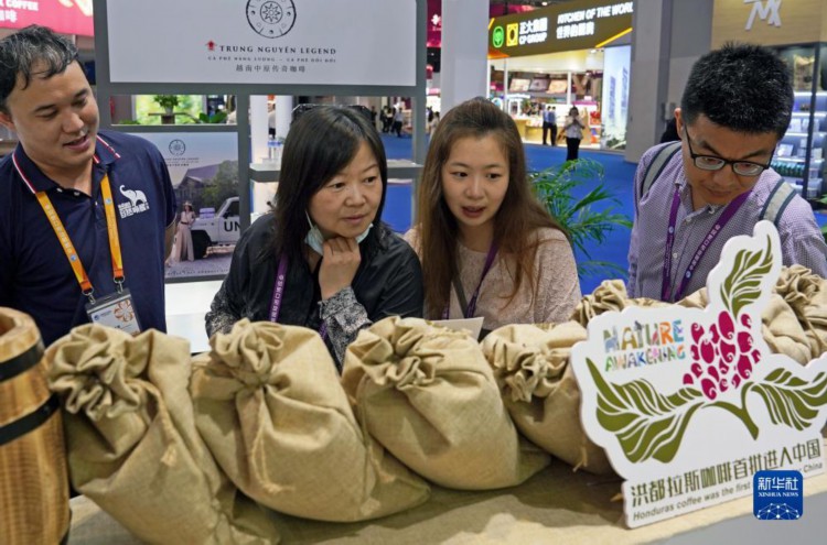 11月5日,观众在第六届进博会食品及农产品展区参观首次亮相中国的洪都拉斯咖啡豆。 当日,第六届中国国际进口博览会在国家会展中心(上海)开幕,众多首发首展的新科技、新成果、新展品亮相本届进博会。 新华社记者 刘颖 摄