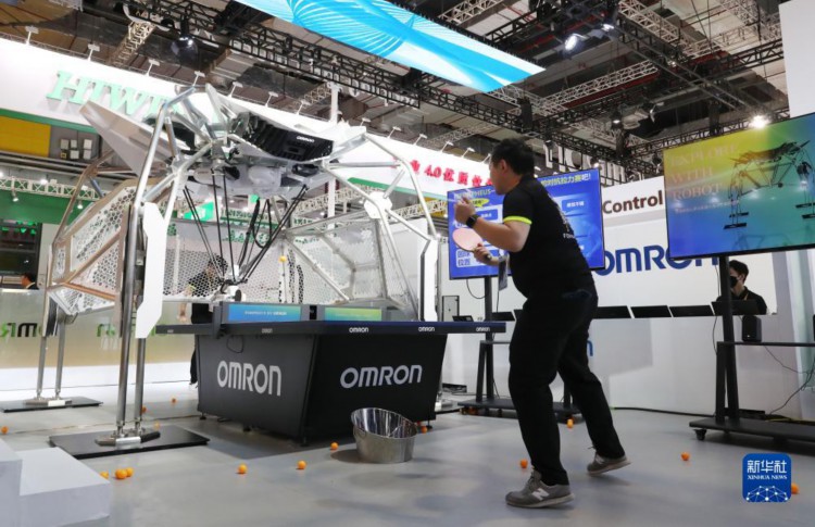 11月5日,工作人员(右)在第六届进博会上展示欧姆龙公司展出的第八代FORPHEUS乒乓球教练机器人。 当日,第六届中国国际进口博览会在国家会展中心(上海)开幕,众多首发首展的新科技、新成果、新展品亮相本届进博会。 新华社记者 方喆 摄