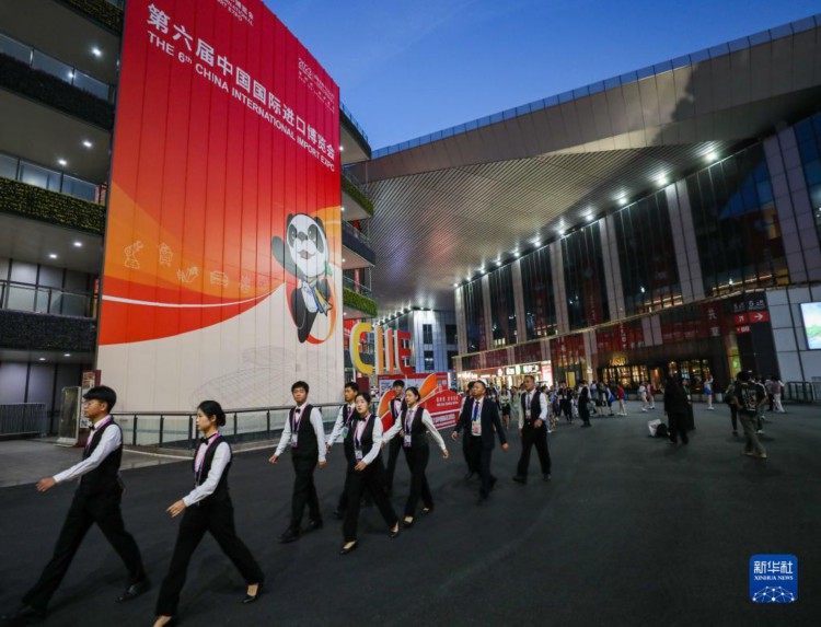 11月5日,工作人员在国家会展中心(上海)经过第六届进博会巨幅海报。 当日,第六届中国国际进口博览会在国家会展中心(上海)开幕,众多首发首展的新科技、新成果、新展品亮相本届进博会。 新华社记者 辛梦晨 摄