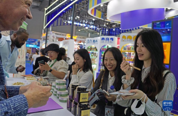 11月5日,在第六届进博会食品及农产品展区,参观者试吃贝宁蜂蜜。 当日,第六届中国国际进口博览会在国家会展中心(上海)开幕,众多首发首展的新科技、新成果、新展品亮相本届进博会。 新华社记者 刘颖 摄