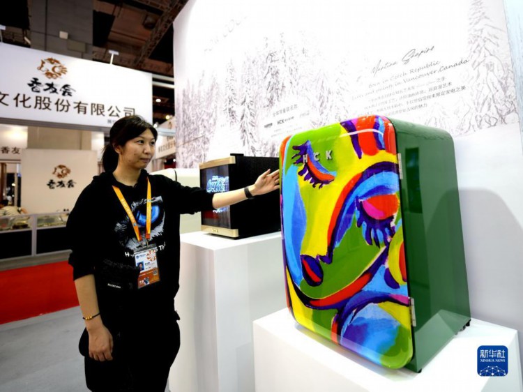 11月5日,在第六届进博会消费品展区HCK哈士奇冰吧展台,工作人员介绍首次展示的一款复古冰箱。 当日,第六届中国国际进口博览会在国家会展中心(上海)开幕,众多首发首展的新科技、新成果、新展品亮相本届进博会。 新华社记者 张建松 摄