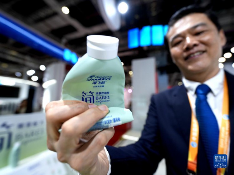 11月5日,在第六届进博会消费品展区宝洁展台,工作人员介绍在中国首次展出的一款新产品,可以将瓶身卷起来,用到空瓶不浪费。 当日,第六届中国国际进口博览会在国家会展中心(上海)开幕,众多首发首展的新科技、新成果、新展品亮相本届进博会。 新华社记者 张建松 摄