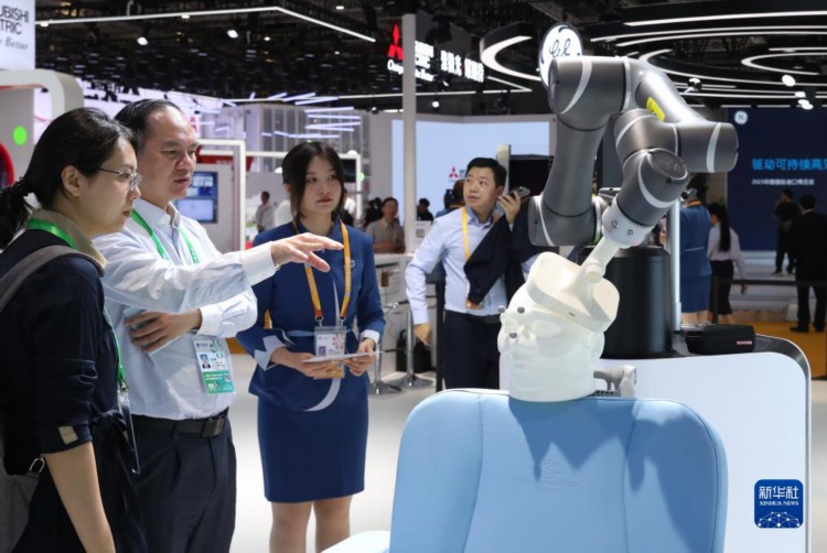 11月5日,参观者在第六届进博会欧姆龙公司展出的黑海豚靶向磁刺激机器人展品旁交流。 当日,第六届中国国际进口博览会在国家会展中心(上海)开幕,众多首发首展的新科技、新成果、新展品亮相本届进博会。 新华社记者 方喆 摄