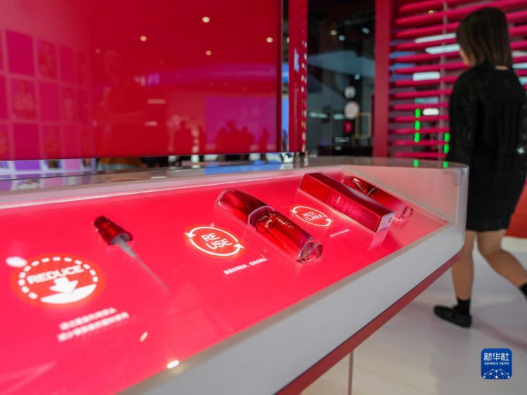 11月5日在第六届进博会消费品展区资生堂展台拍摄的红腰子空瓶。资生堂在进博会上首发首秀的“红腰子空瓶再续计划”,可让化妆品空瓶实现100%循环使用。 当日,第六届中国国际进口博览会在国家会展中心(上海)开幕,众多首发首展的新科技、新成果、新展品亮相本届进博会。 新华社记者 丁汀 摄