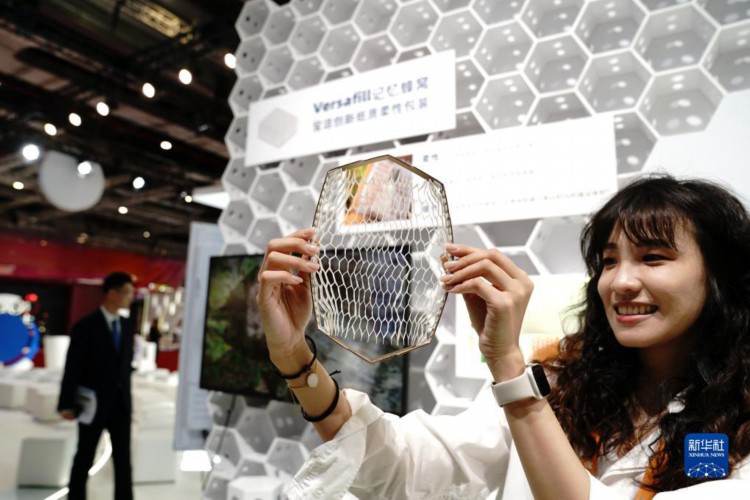 11月5日,在第六届进博会消费品展区宝洁展台,工作人员介绍全球首发的“记忆蜂窝”创新纸质柔性包装产品。 当日,第六届中国国际进口博览会在国家会展中心(上海)开幕,众多首发首展的新科技、新成果、新展品亮相本届进博会。 新华社记者 张建松 摄