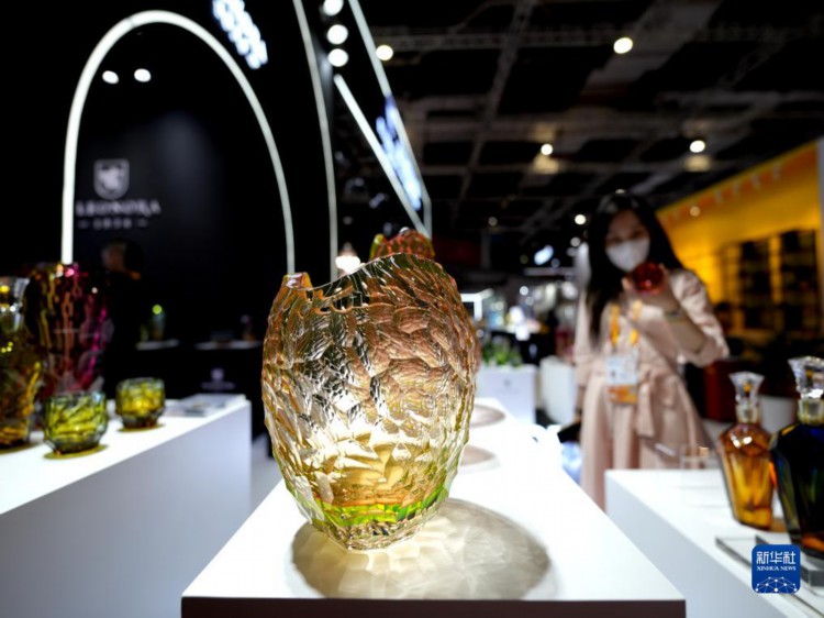 11月5日,观众在第六届进博会消费品展区捷克欧若拉水晶展台参观首次展出的水晶新品。