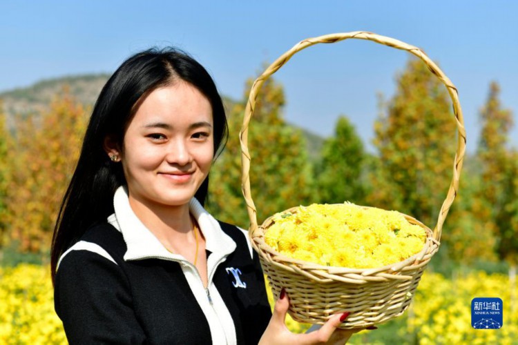 11月4日,在嘉祥县纸坊镇有机菊花种植基地,工作人员展示采摘的菊花。 近年来,山东省济宁市嘉祥县大力发展有机菊花产业,通过农业龙头企业带动,提升品牌价值。目前,嘉祥县有机菊花种植面积近万亩,菊花产业成为农民增收、农业增效和推动乡村振兴的新动能。 新华社记者 郭绪雷 摄