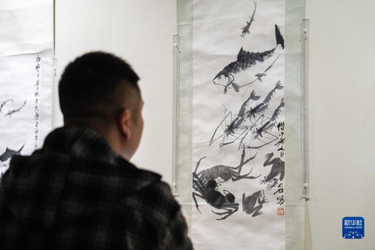 11月5日,在湘潭市博物馆,观众在观看齐白石作品《虾蟹图》。