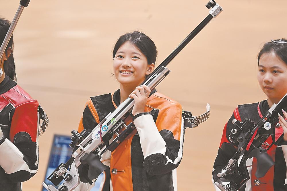 5日下午的女子50米步枪三种姿势比赛中,代表福州队参赛的杨滨凌(左)以3.2分的优势战胜对手夺冠。 张旭阳 摄
