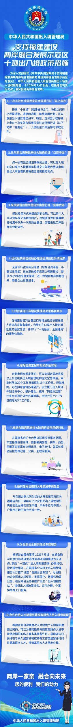 新华社北京11月6日电(记者任沁沁)记者6日从中华人民共和国出入境管理局获悉,为深入贯彻落实《中共中央 国务院关于支持福建探索海峡两岸融合发展新路 建设两岸融合发展示范区的意见》,该局紧扣两岸融合发展示范区建设规划,聚焦台胞台商台企所需所盼,研究出台十项出入境政策措施(以下简称“十项措施”),并将于2024年1月1日起实施,进一步促进闽台人员往来、便利台胞在闽居住生活,深化两岸各领域融合发展。