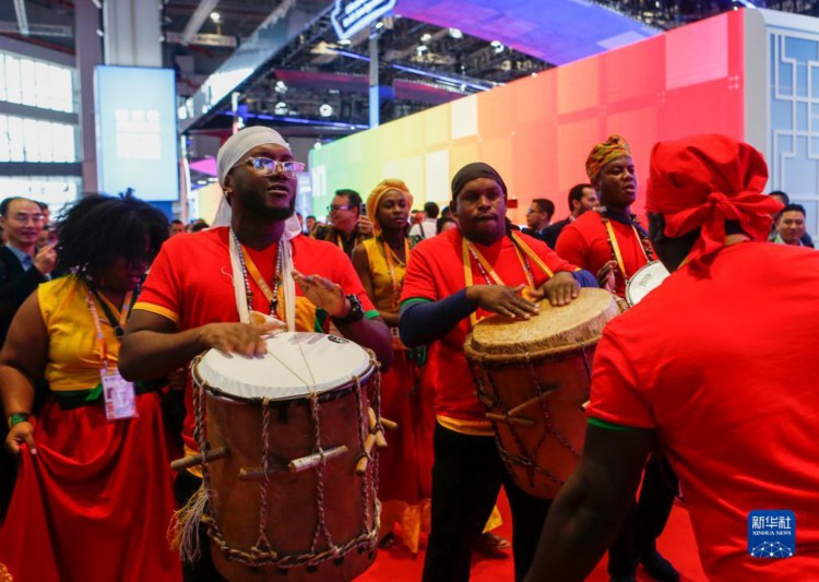 11月6日,来自第六届进博会国家展洪都拉斯展台的演职人员在现场进行文艺表演。 第六届进博会国家展全面恢复线下举办,洪都拉斯、塞尔维亚、越南、南非、哈萨克斯坦作为本届进博会主宾国在国家展亮相。 新华社记者 陈朔 摄