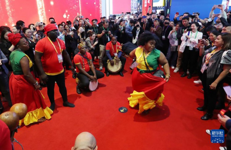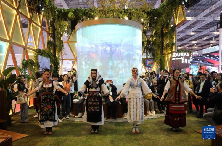 11月6日,在第六届进博会国家展塞尔维亚展台,参观者在观看舞蹈。 第六届进博会国家展全面恢复线下举办,洪都拉斯、塞尔维亚、越南、南非、哈萨克斯坦作为本届进博会主宾国在国家展亮相。 新华社记者 李梦娇 摄