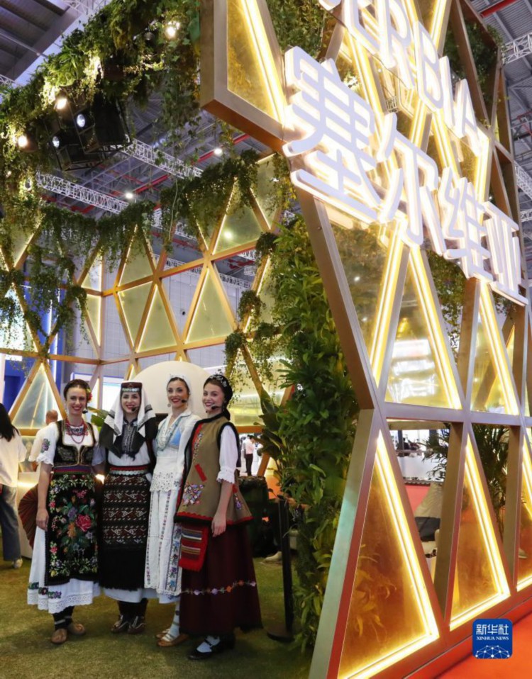 11月6日,身着传统服饰的演职人员在第六届进博会国家展塞尔维亚展台迎接参观者。 第六届进博会国家展全面恢复线下举办,洪都拉斯、塞尔维亚、越南、南非、哈萨克斯坦作为本届进博会主宾国在国家展亮相。 新华社记者 方喆 摄