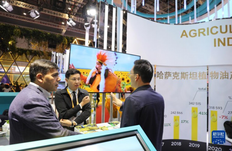 11月6日,参观者在第六届进博会国家展哈萨克斯坦展台洽谈。 第六届进博会国家展全面恢复线下举办,洪都拉斯、塞尔维亚、越南、南非、哈萨克斯坦作为本届进博会主宾国在国家展亮相。 新华社记者 李梦娇 摄