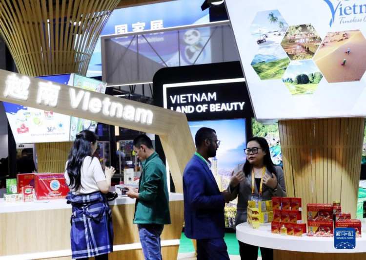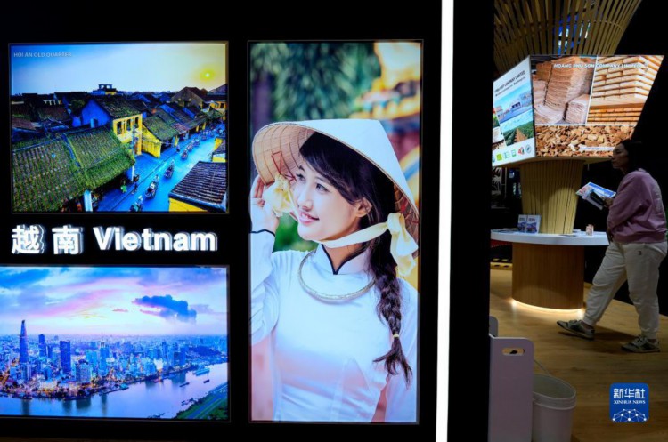 11月6日拍摄的第六届进博会国家展越南展台。 第六届进博会国家展全面恢复线下举办,洪都拉斯、塞尔维亚、越南、南非、哈萨克斯坦作为本届进博会主宾国在国家展亮相。 新华社记者 张建松 摄