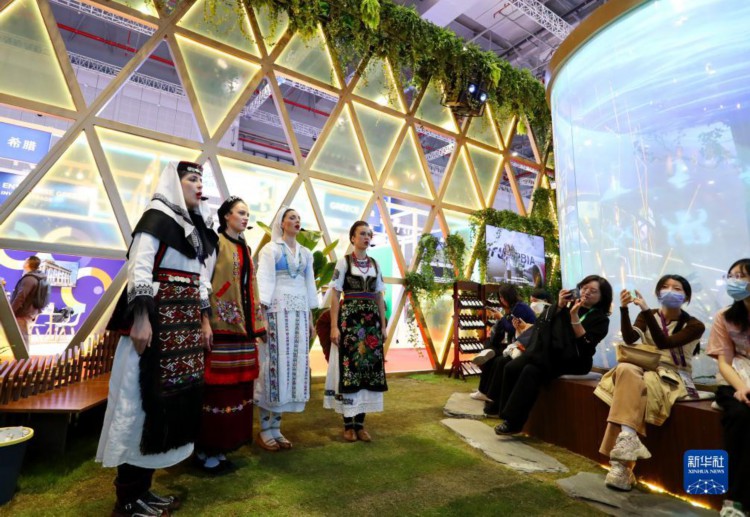 11月6日,演职人员在第六届进博会国家展塞尔维亚展台演唱传统歌曲。 第六届进博会国家展全面恢复线下举办,洪都拉斯、塞尔维亚、越南、南非、哈萨克斯坦作为本届进博会主宾国在国家展亮相。 新华社记者 方喆 摄