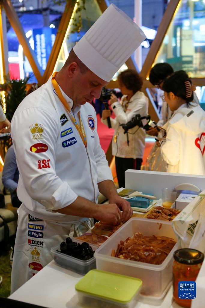 11月6日,来自第六届进博会国家展塞尔维亚展台的工作人员在展会现场制作塞尔维亚特色美食。 第六届进博会国家展全面恢复线下举办,洪都拉斯、塞尔维亚、越南、南非、哈萨克斯坦作为本届进博会主宾国在国家展亮相。 新华社记者 陈朔 摄