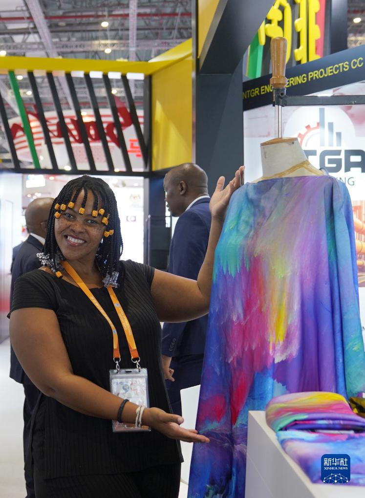 11月5日,在第六届进博会国家展南非展台,南非参展商推介服装。