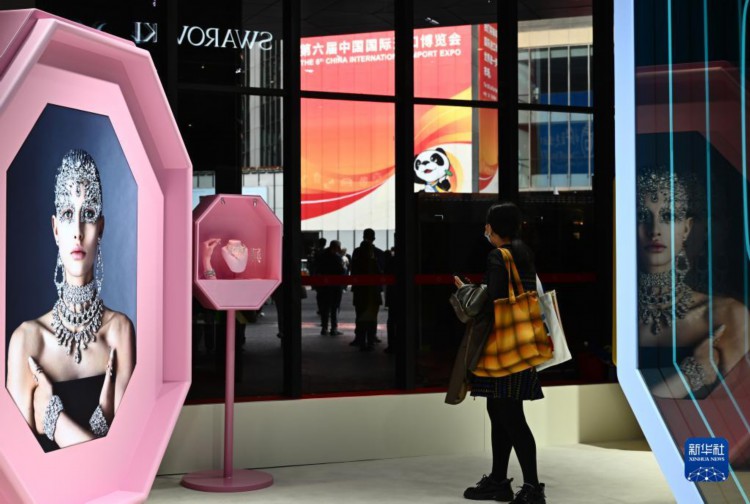 11月6日,观众在施华洛世奇展厅参观。 第六届进博会消费品展区共有来自76个国家和地区的500多家企业参展。其中,世界500强及行业龙头企业57家,全球知名智能家电品牌纷纷亮相,世界时尚高端消费品、美妆及日化用品、体育用品巨头齐聚一堂。 新华社记者 金良快 摄