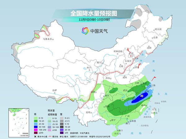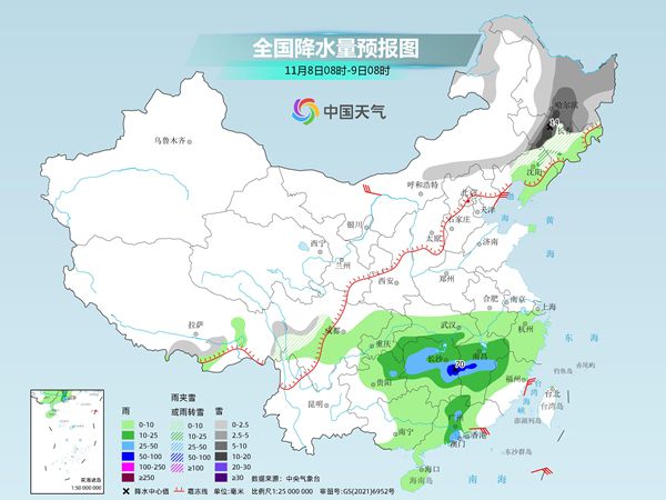 具体来看,中央气象台预计,今天,内蒙古东部和西北部、黑龙江东部、西藏北部和东部等地部分地区有小到中雪或雨夹雪,其中,黑龙江东北部局地有大雪(5~9毫米)。江汉东部、江南大部、西南地区东部、云南南部、华南大部等地部分地区有小到中雨,局地有大雨(25~45毫米)。