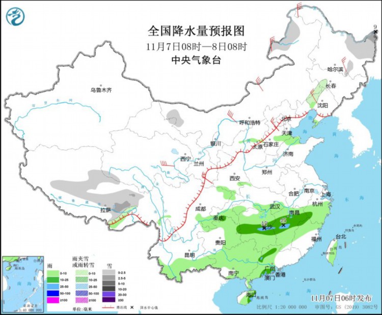 图1 全国降水量预报图(11月7日08时-8日08时) 图片来源:中央气象台网站