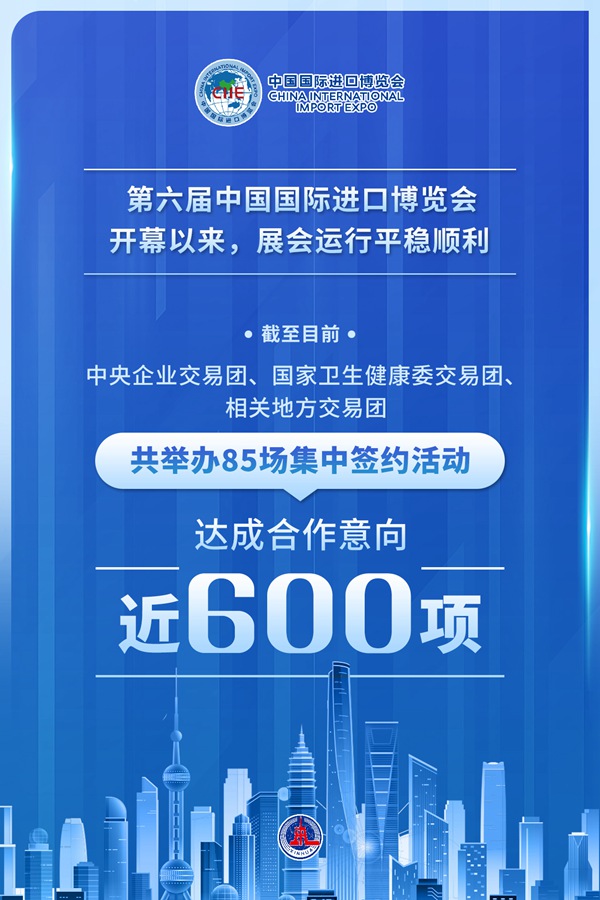 新华社上海11月7日电(记者周蕊、谢希瑶)第六届中国国际进口博览会开幕以来,展会运行平稳顺利。截至目前,中央企业交易团、国家卫生健康委交易团、相关地方交易团共举办85场集中签约活动,达成合作意向近600项。