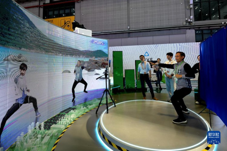 11月7日,在第六届进博会技术装备展区,观众体验“互动健身房”。