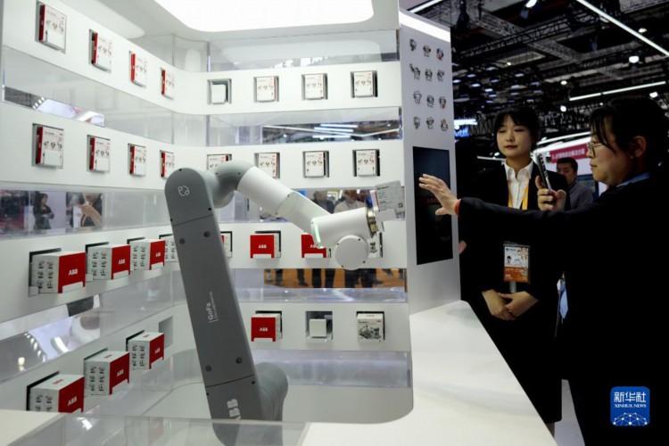 11月7日在第六届进博会技术装备展区ABB展台拍摄的机器人。
