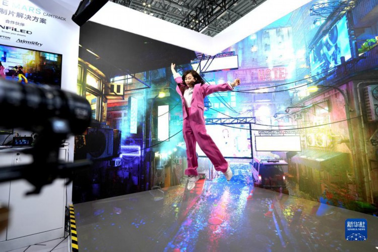 11月7日,在第六届进博会技术装备展区,观众与“虚拟制片”设备进行互动。