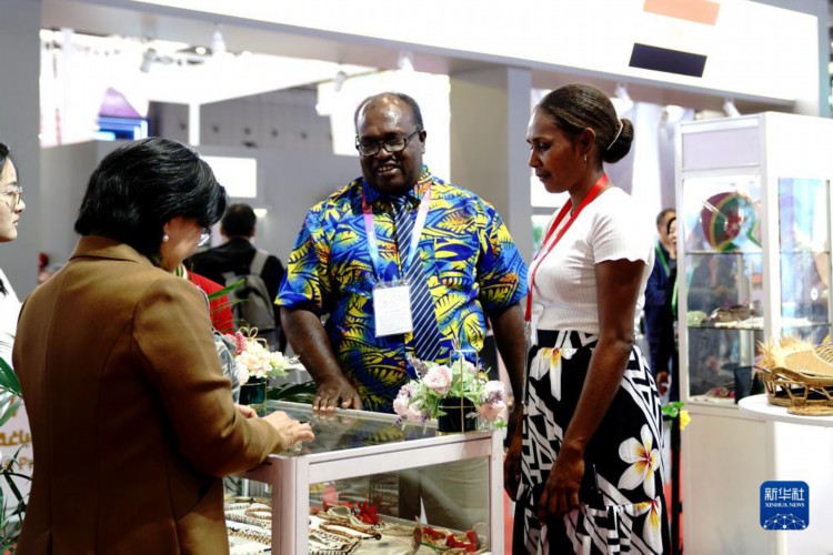 11月7日,在第六届进博会国家展区,所罗门群岛参展商接待观众。