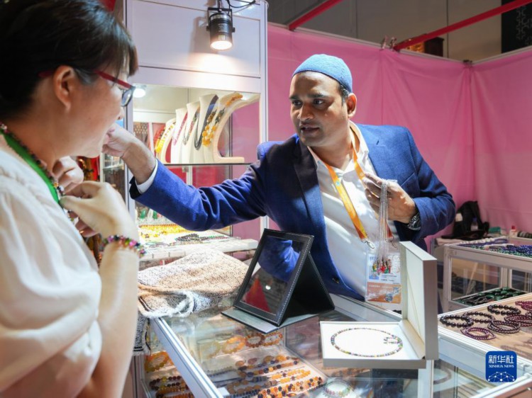 11月7日,在第六届进博会消费品展区,一名来自巴基斯坦的展商向参观者介绍项链。
