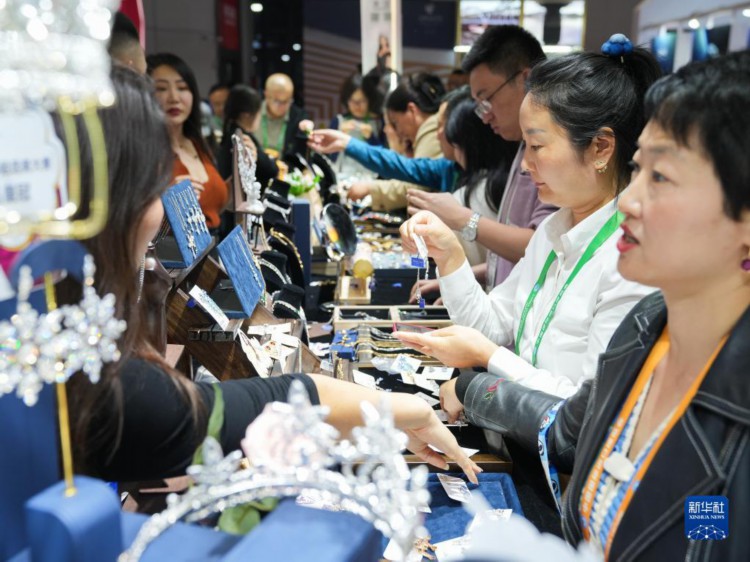 11月7日,在第六届进博会消费品展区,参观者在挑选来自捷克的水晶制品。