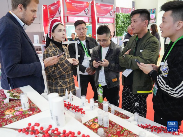 11月7日,在第六届进博会消费品展区,参观者在咨询来自俄罗斯的产品信息。