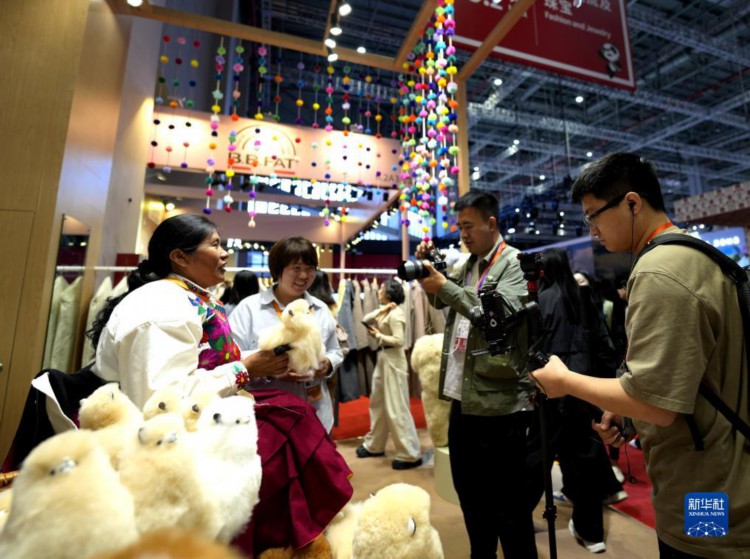 11月7日,在第六届进博会消费品展区“温暖驼”展台,秘鲁手工艺人接受媒体采访。