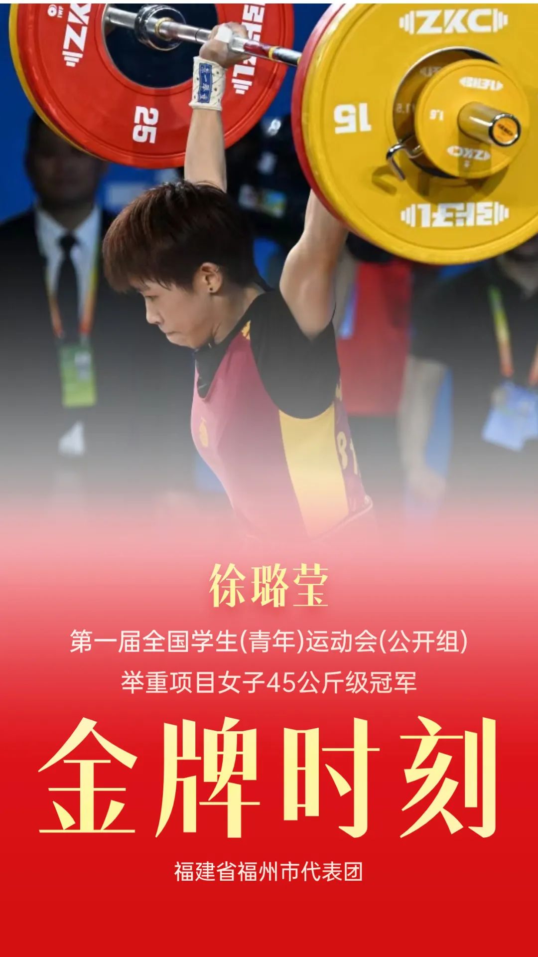 11月6日上午,在第一届全国学生(青年)运动会(公开组)举重项目女子45公斤级比赛中,福建福州市体育代表团运动员徐璐莹,以抓举85公斤、挺举103公斤,总成绩188公斤的优异成绩夺得该级别冠军!