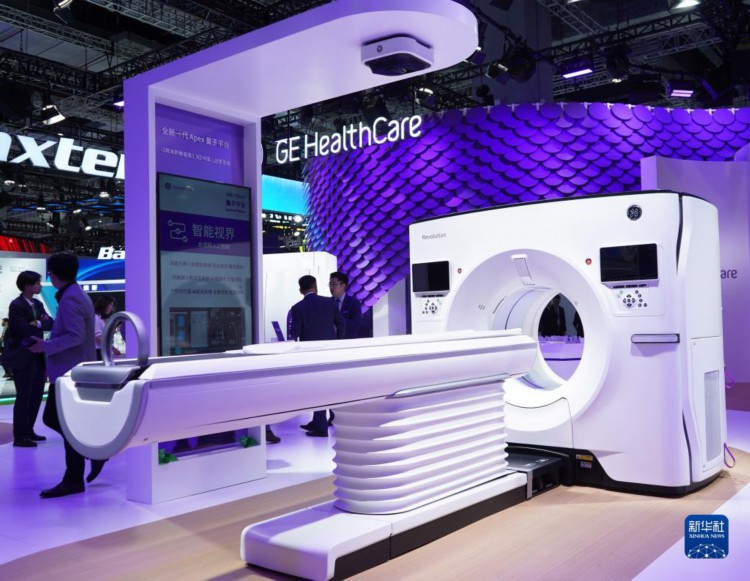11月6日,在第六届进博会医疗器械及医药保健展区GE医疗展台拍摄的全新一代Apex量子平台。