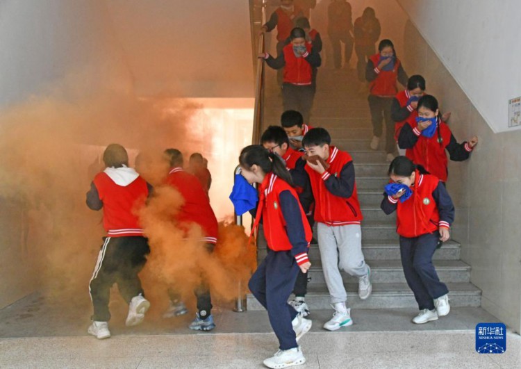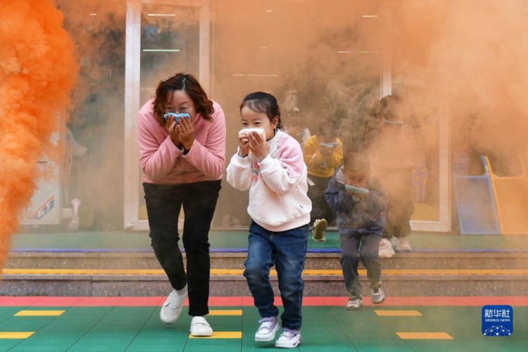 11月8日,在山东省烟台市福山区清洋街道城西幼儿园,老师引导小朋友进行消防应急疏散演练。 11月9日是第32个全国消防日,今年的活动主题为“预防为主,生命至上”。 新华社发(孙文潭 摄)