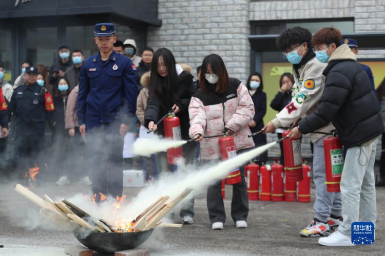 11月8日,沈阳工学院学生演练使用灭火器。 11月9日是第32个全国消防日,今年的活动主题为“预防为主,生命至上”。 新华社记者 杨青 摄