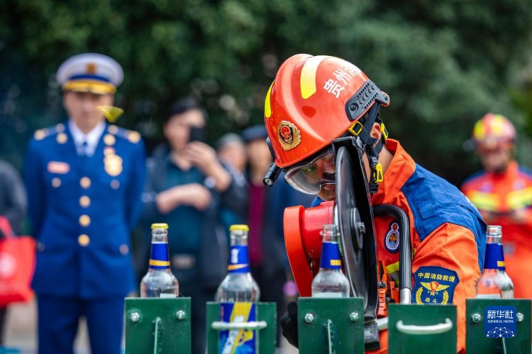 11月8日,在贵州省黔西市水西广场,消防员演示双轮异向切割机开瓶盖。 11月9日是第32个全国消防日,今年的活动主题为“预防为主,生命至上”。 新华社发(范晖 摄)