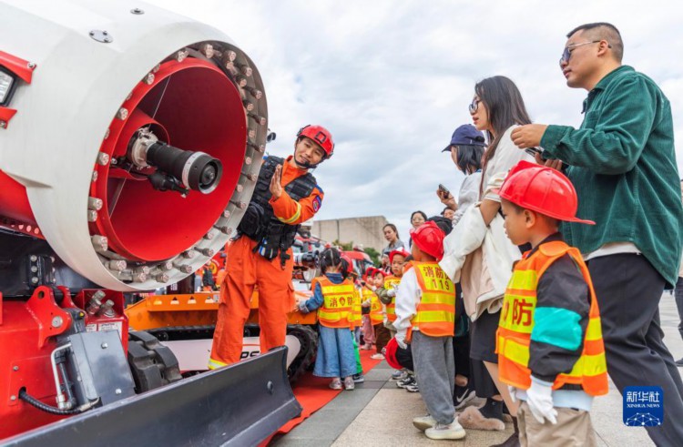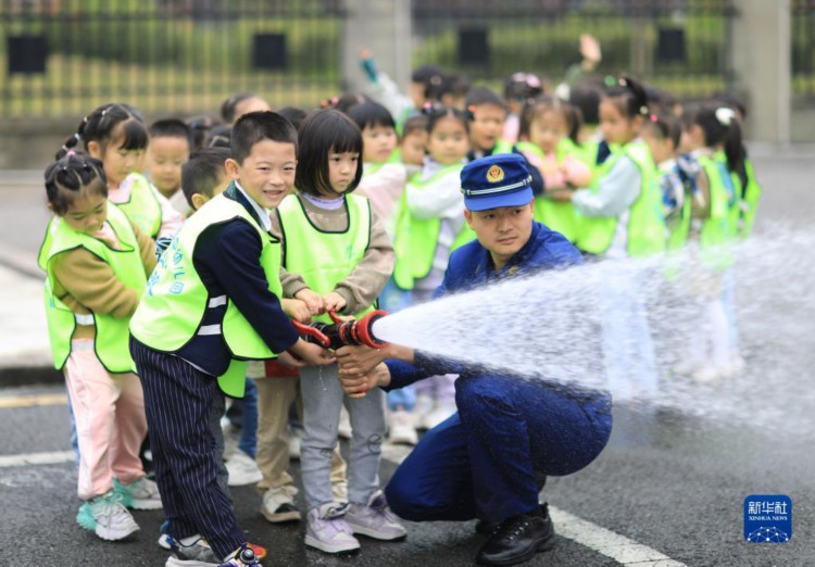 11月8日,在贵州省赤水市消防救援大队,小朋友在消防救援队员的辅导下体验使用消防水枪。 11月9日是第32个全国消防日,今年的活动主题为“预防为主,生命至上”。 新华社发(王长育 摄)