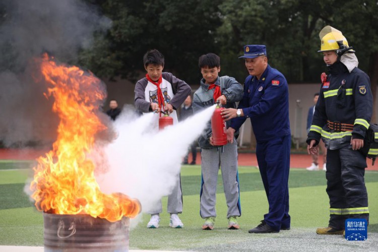 11月8日,在浙江省湖州市吴兴区埭溪镇上强小学,学生在消防员指导下使用灭火器。 11月9日是第32个全国消防日,今年的活动主题为“预防为主,生命至上”。 新华社发(何伟卫 摄)