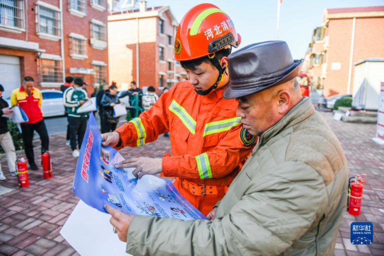 11月8日,在河北省遵化市西三里镇一社区,消防救援人员向村民普及消防知识。 11月9日是第32个全国消防日,今年的活动主题为“预防为主,生命至上”。 新华社发(刘满仓 摄)