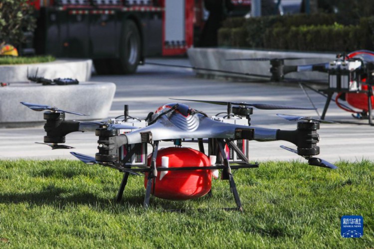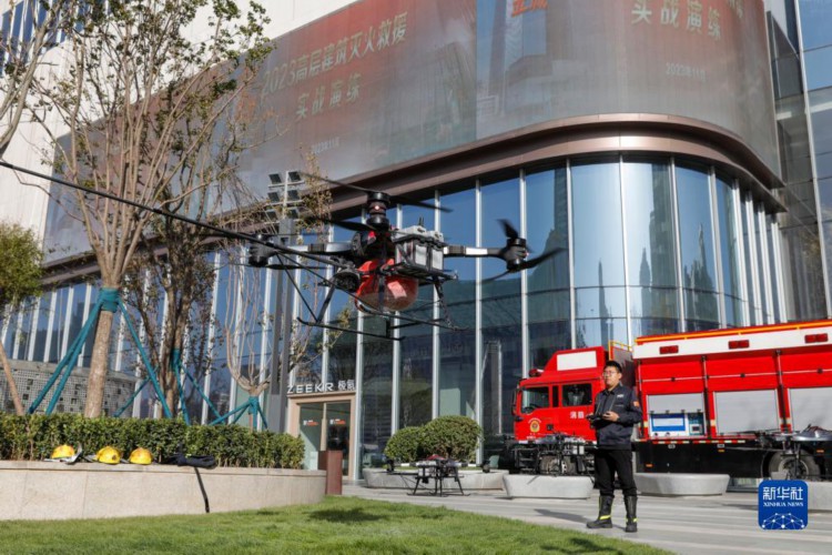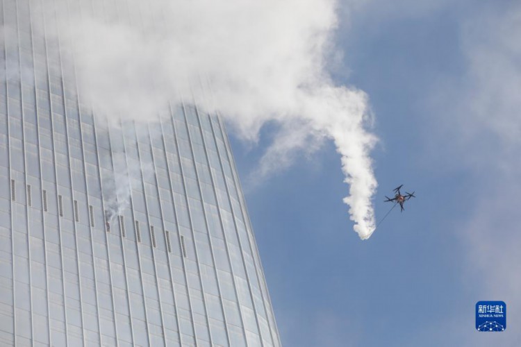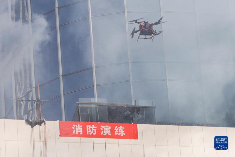 11月8日,高喷灭火无人机进行高层建筑灭火救援实战演练。