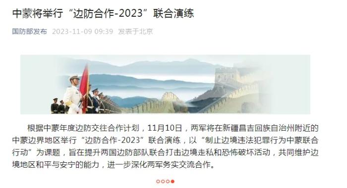 国防部:中蒙将举行“边防合作-2023”联合演练