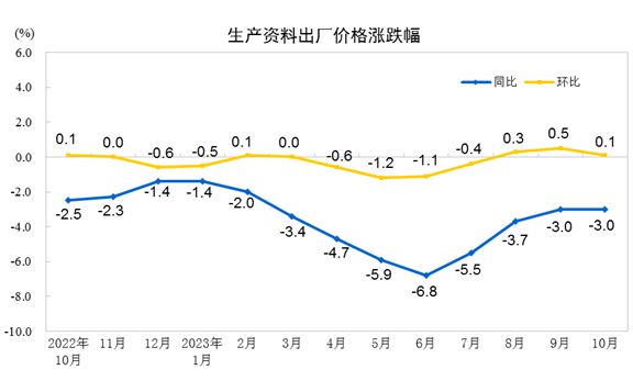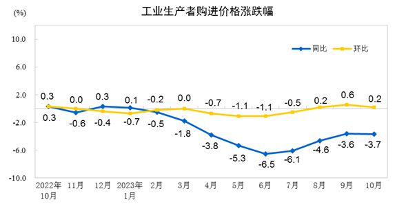 中新网11月9日电 据国家统计局网站消息,2023年10月份,全国工业生产者出厂价格同比下降2.6%,环比持平;工业生产者购进价格同比下降3.7%,环比上涨0.2%。1—10月平均,工业生产者出厂价格比上年同期下降3.1%,工业生产者购进价格下降3.6%。