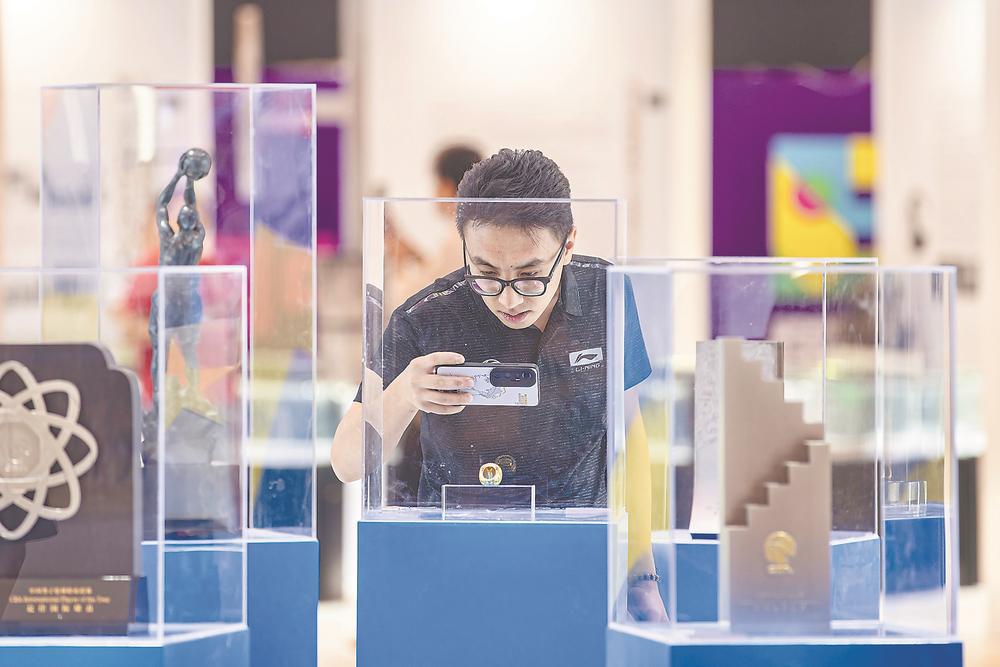 观众观看中国篮球职业联赛(CBA)相关展品。 本报记者 林熙 摄